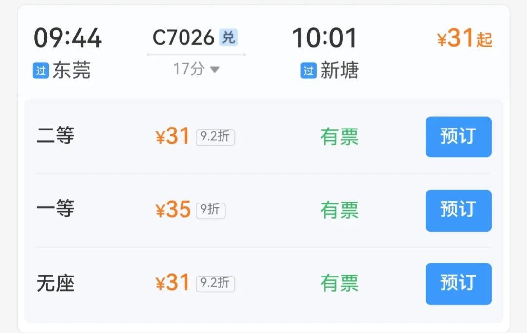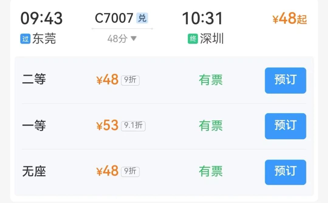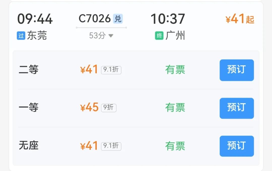 此次调价后,广深、穗莞、莞深三地间的城际出行成本均有不同程度下降。例如,往返穗莞单程的二等座从45.5元降至41元,往返莞深单程的二等座从53.5降至48元。