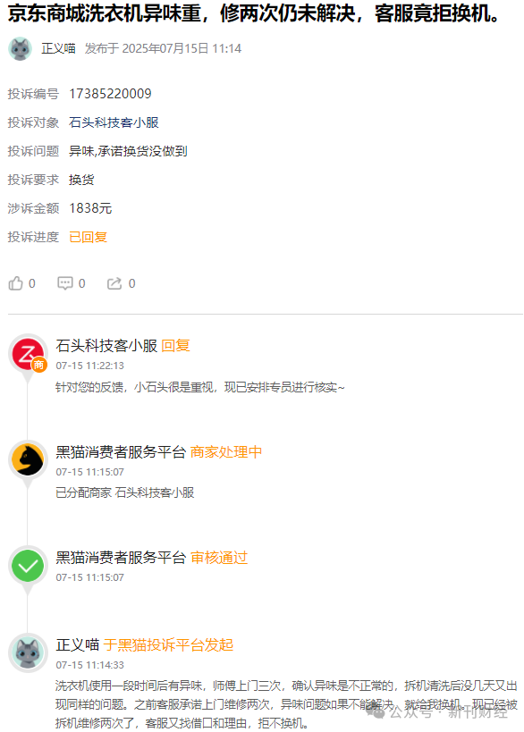 此外,黑猫投诉平台显示,对石头科技的累计投诉已超过1600条,其中不乏对各类产品的商品质量及销售服务的投诉。7月15日有一名消费者反映,“京东商城洗衣机异味重,修两次仍未解决,客服竟拒换机”。