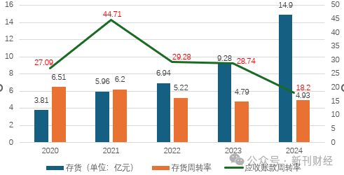 另外,存货高企的问题也越发明显。2024年末存货达14.90亿元,同比增加60.54%;至2025年一季度末进一步上升至25.87亿元,环比陡增73.62%。存货周转率从2020年的6.51下滑至2024年的4.93,降低了1.58个百分点,折射出存货流动性承压与管理效能不足。应收账款周转率的波动更为明显,2021年高至44.71,2024年却已降至18.20,公司营运效率的下降已不容忽视。若未来需求减弱或库存管理效率未能有效提升,存货积压与周转放缓可能形成负向循环,进而对公司业绩产生更大的负面影响。