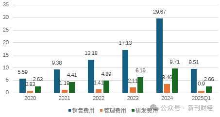 销售费用的持续攀升可能是石头科技“增收不增利”现象的核心动因。2024年,公司销售费用高达29.67亿元,同比大幅增长73.20%,其增速显著高于营收增速。2025年第一季度,这一趋势仍在延续,销售费用同比激增169.25%至9.51亿元,成为影响盈利的主要因素。另外,管理费用增势亦较为明显,2024年达3.46亿元,同比增长63.83%,四年累计增长315.69%。