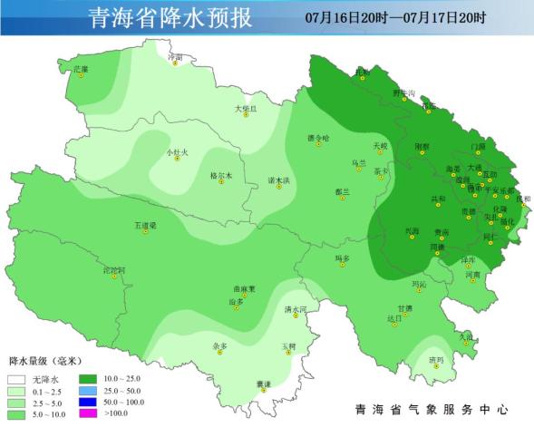 16日-17日:西宁市;海东市;海西州东部、格尔木市;海北州;海南州;黄南州大部;果洛州中北部;玉树州曲麻莱县、治多县、久治县有阵雨或雷阵雨,其中西宁市大通县、湟中区、湟源县;海东市平安区、乐都区、互助县、化隆县;海北州祁连县、刚察县、门源县;黄南州尖扎县;海南州共和县、贵德县、兴海县、贵南县有中到大雨,省内其余地区晴或多云,过程期间伴有短时强降水、雷暴大风、冰雹等强对流天气。