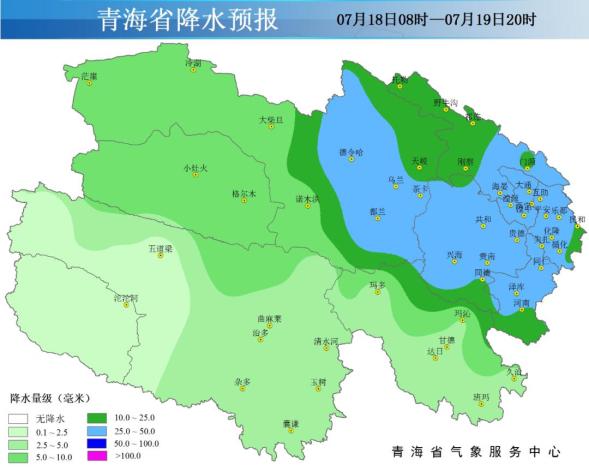 青海省07月18日白天至19日夜间累积降水量预报图如下: