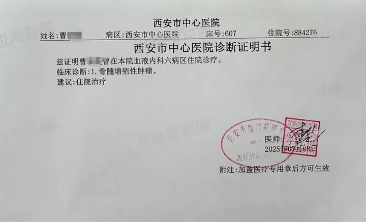 7月8日,西安市血液病研究所出具诊断证明书,确诊为骨髓增殖性肿瘤,建议住院治疗。当前,曹女士在西安市中心医院住院治疗。