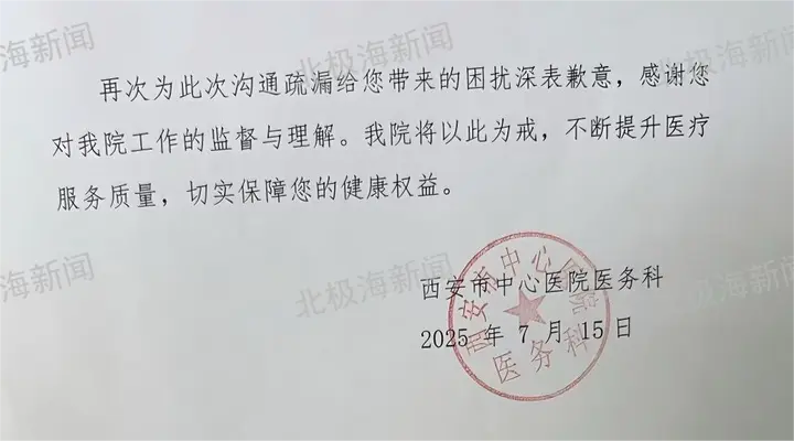 7月15日,西安市中心医院医务科向曹女士做出书面回复,确认妇科主管医生违背了医患沟通的基本要求,已对涉事医生进行批评教育、扣罚绩效。对于曹女士提出的“延误治疗”问题,院方表示,“目前暂无证据显示该情况对您造成实际不良后果。”