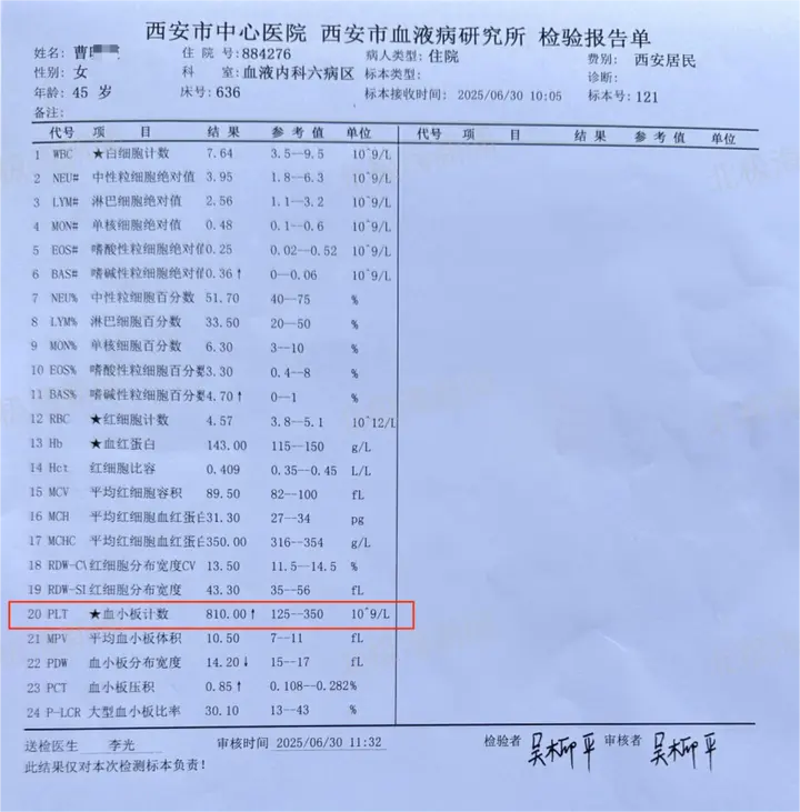 6月29日,曹女士因感冒咳嗽到社区卫生服务中心就医,血常规检查结果显示血小板计数624,远超正常参考值范围(125-350),二次检查仍高达586,医生建议前往大医院做进一步检查。次日,曹女士到西安市中心医院血液科就诊,检验报告单显示血小板计数高达810。