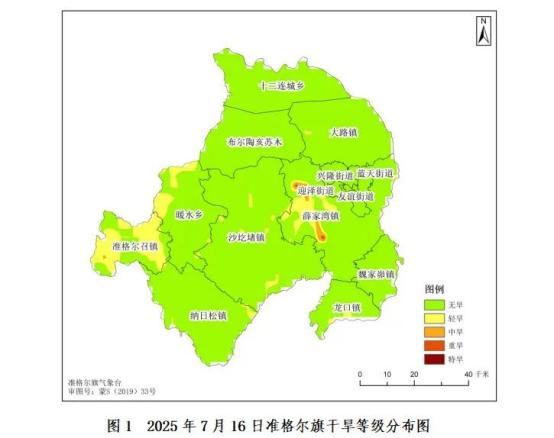 连续晴热天气加剧土壤水分蒸发。7月16日土壤墒情数据显示,目前我旗薛家湾镇、准格尔召镇、龙口镇南部、暖水乡西部已出现部分轻旱区域,薛家湾镇迎泽街道附近旱情程度偏重。