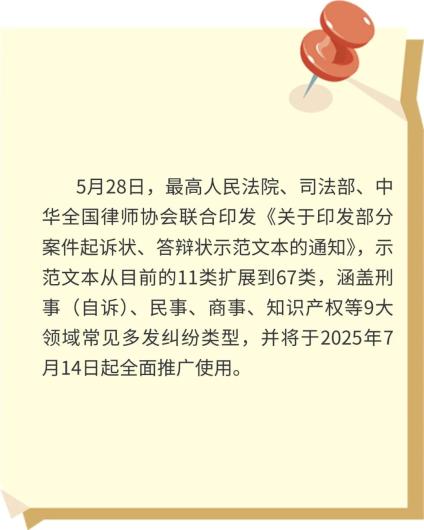 针对第一批11类试行示范文本进行修改完善,又针对刑事(自诉)、民事、商事、知识产权、海事、行政、环境资源、国家赔偿、执行等9个领域常见多发诉讼案件研究制定56类新的示范文本。