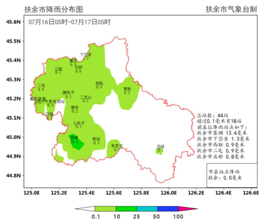 受低涡切变影响,7月16日扶余市出现分布不均的阵雨天气,截至17日05时,扶余市共出现1站中雨;降雨量前五位站点是:增胜镇茶棚13.4毫米,长春岭镇下岱吉1.3毫米,大林子镇西联0.9毫米,三骏乡二屯0.9毫米,长春岭镇石桥0.8毫米(见附图)。扶余市平均降雨量为0.5毫米。