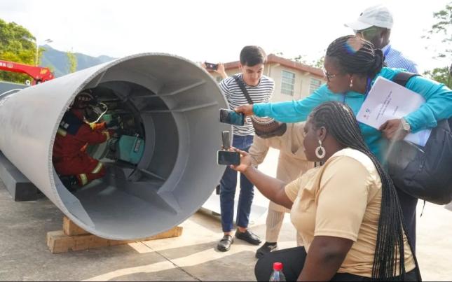 边坡机械化施工成套设备、多功能钻机、智能注浆设备……在铁建重工集团展区,尼日利亚学员拿出手机,不断拍摄标记各种应急装备。“快速进入!”在自进式救援通道设备处,学员们围观国家隧道应急救援中铁十七局太原队展示专业应急救援队伍能力建设,“救援真迅速!”马来西亚学员随着其他学员一起发出感叹。