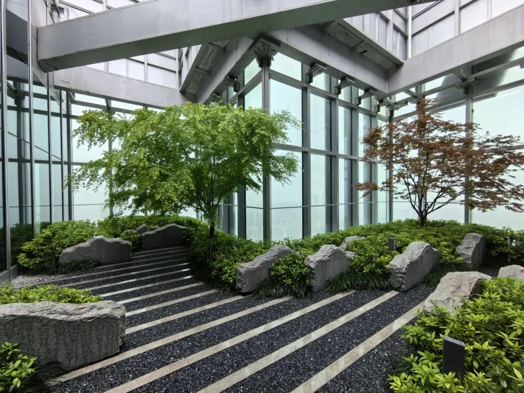室内绿墙栽植鸭脚木、红掌、各色竹芋与蕨类,叶色浓郁、生机盎然;室外曲线花园中,红花檵木与夏鹃交替点缀,瓜子黄杨等灌木构筑常绿基底,桂花与樱花形成高低错落的丰富层次;廊桥处阶梯式花带与灰色地砖自然衔接,趣味横生;枫韵庭院区则以黑石与板岩铺地,各色枫树与造型石相映成趣,营造出静谧意境。整体设计兼顾观赏与休憩,让人在绿意丛中一览都市风光、尽享清新之感。