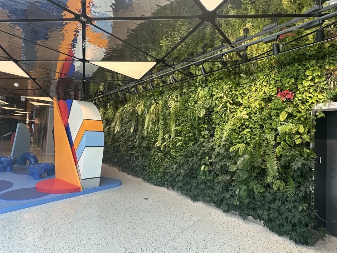 屋顶花园以紫薇为主景,汇聚金姬小蜡、百子莲、彩虹蕨、火焰南天竹、绣球、风车茉莉等20余种植物,呼应天际线。垂直绿化精选吊兰、亮晶女贞、栀子花、火焰南天竹、矾根等,借台阶与墙面勾勒流动绿线。四季流转间,春夏繁花竞放,秋季色叶斑斓,植物季相交替让商业空间焕发动态生机,实现景观与商业价值的双向提升。