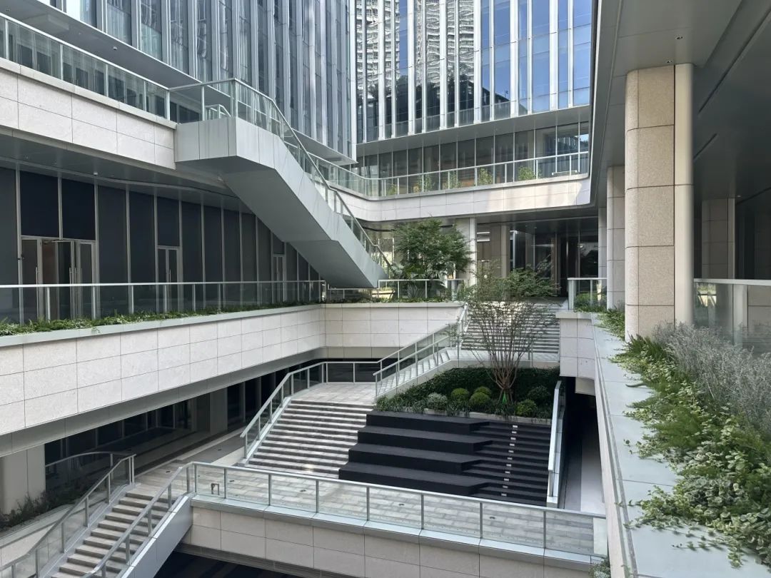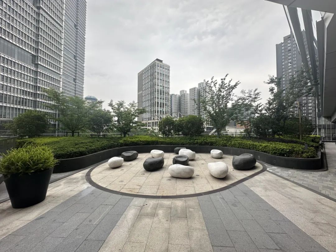 花园各楼层采用了无障碍设计,将商业与办公区域进行串联,设置弹性办公区域、共享坐凳、城市景观吧台、风动装置等,结合树池花境和沿口绿植花槽,将整个街区打造成开放有活力的绿色生态空间,让人在高楼大厦之间亲近自然,也为市民和办公人员在忙碌的都市生活中能放松身心,提供了休闲放松的综合场所。