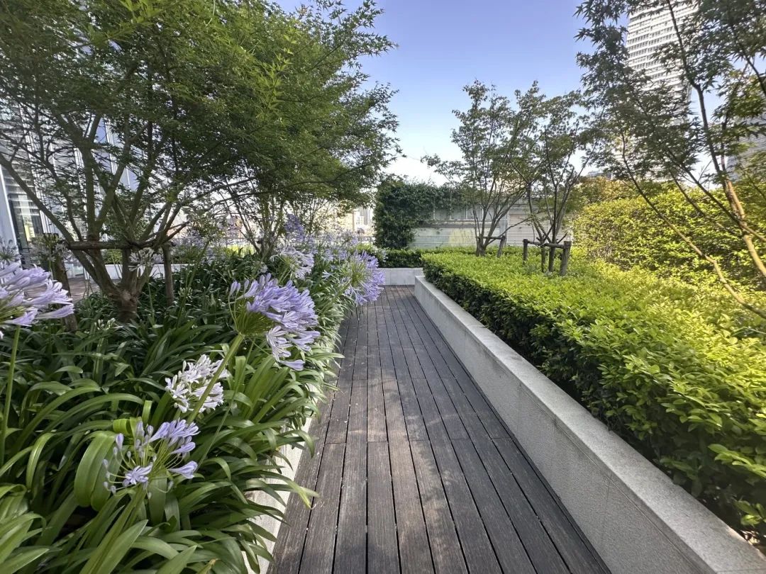 屋顶花园视野开阔,直面东方明珠等地标建筑群,成为北外滩地区少有的空中景观资源,实现“可游、可赏、可留”,为城市空间增添宜人休憩场所。设备用房及钢结构处设置风车茉莉等爬藤植物,柔化设施界面;沿屋顶边缘采用成片绿化带,形成自然过渡与点缀;局部墙面铺设绿墙,丰富立面景观;大面积区域则布局花园式屋顶绿化,设置休憩步道与观景节点,兼顾观赏与使用功能。植物配置注重四季变化与景观效果,常绿乔灌木(大叶黄杨、金森女贞)构成基底,红叶石楠、木槿等丰富色彩,搭配百子莲等观花植物,确保春有花、夏有荫、秋有彩、冬常绿。