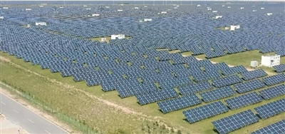 在青藏高原东北部的青海省海南藏族自治州共和县,塔拉滩曾是一片戈壁荒滩。如今,塔拉滩上数百万块深蓝色光伏板如同一片浩瀚的“蓝色海洋”,与周边复苏的绿色草甸相辉映。