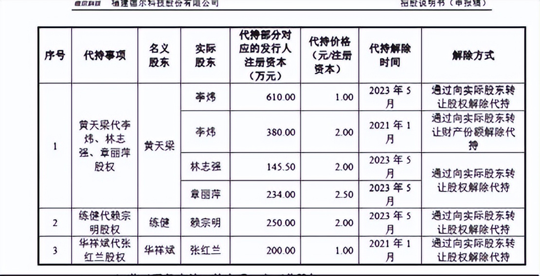 更令人不解的是,2021年1月,黄天梁通过向实际股东以2元/注册资本的价格转让财产份额,解除了与李炜之间380万元注册资本的代持关系。然而,其余的610万元注册资本的代持关系却仍然持续,直到2023年5月——公司递交IPO申请前一个月才突然解除。