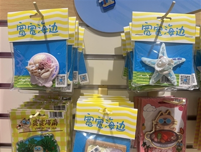 海风穿过店门,吹动着悬挂的冰箱贴样品,叮当声里混着手机扫码支付的提示音。在另一家海边宽宽店里,市民游客正沉浸挑选心仪冰箱贴。