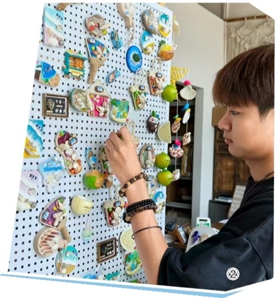 ② 游客在三亚一家小店选购心仪冰箱贴。