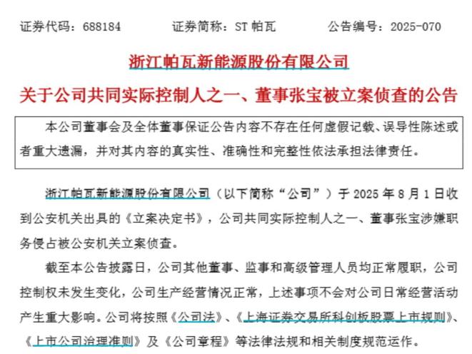 8月3日,A股科创板上市公司ST帕瓦(688184.SH)公告称,公司共同实际控制人之一张宝被立案。