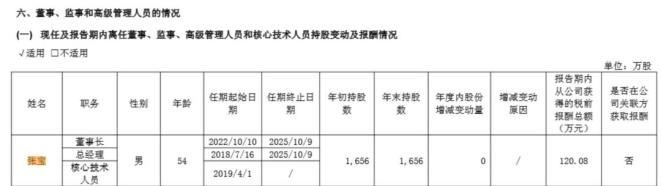2024年年报显示,张宝年薪120.08万元,持股达1656万股。