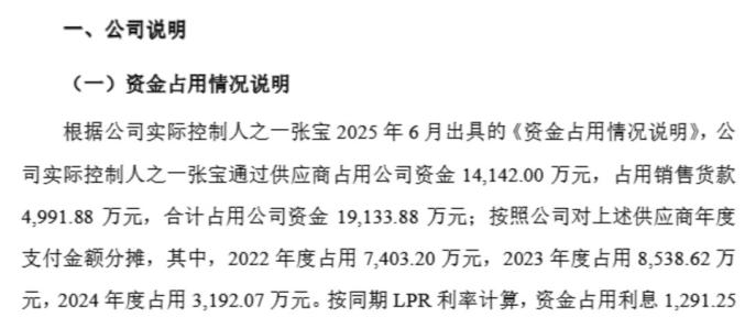 公告显示,公司实际控制人之一张宝通过供应商占用公司资金1.41亿元,占用销售货款4991.88万元,合计占用公司资金1.91亿元;按照公司对上述供应商年度支付金额分摊,其中,2022年度占用7403.20万元,2023年度占用8538.62万元,2024年度占用3192.07万元。按同期LPR利率计算,资金占用利息1291.25万元。上述占用资金本金及利息合计2.04亿元。