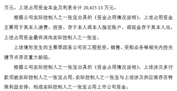 根据公司实际控制人之一张宝出具的《资金占用情况说明》,上述占用资金主要用于其本人消费、投资、存于本人或本人指定账户,或现金存于其本人处,上述占用资金最终流向实际控制人之一张宝。上述情形发生的主要原因系公司在工程投资、销售、采购业务等相关内控关键节点存在重大缺陷。