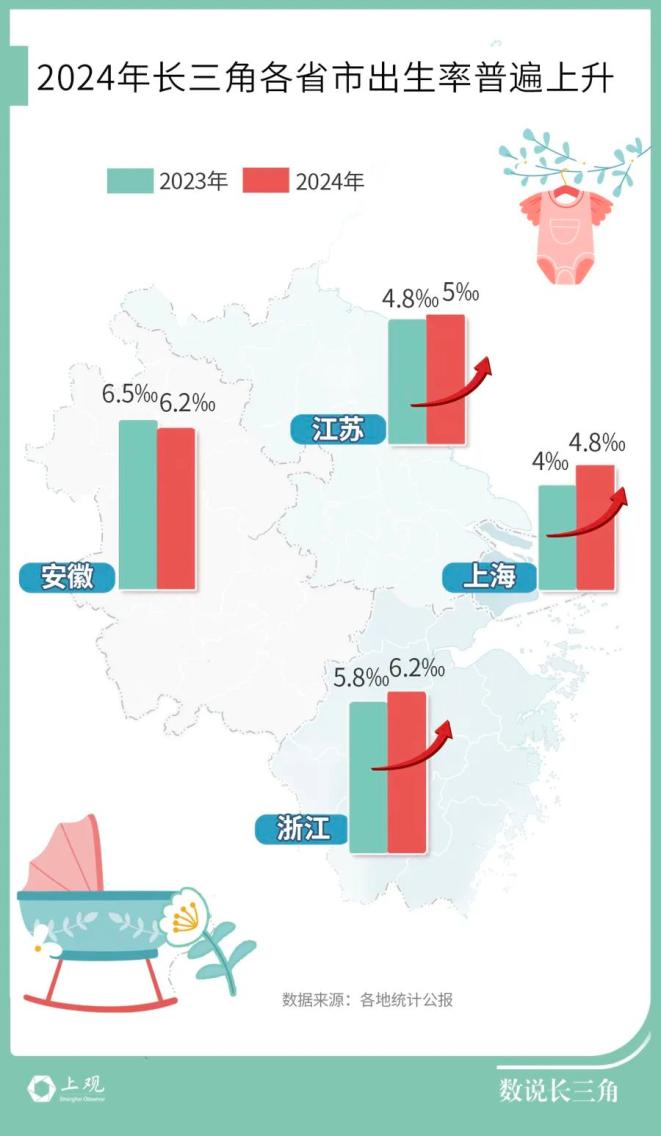 纵观全国,2024年出生人口同比增加52万人,是近8年首次正增长。从长三角地区来看,沪苏浙的出生率均较2023年有所提升,其中浙江较上年上升0.4个千分点,以6.2‰的出生率位居区域首位;上海回升幅度最为明显,从4‰上升至4.8‰;江苏小幅增长至5‰;安徽虽然降至6.2‰,但仍并列区域内第一。