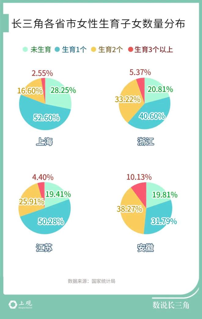 从生育子女数量分布数据上看,上海仍以一孩家庭为主,生育1个孩子的女性占52.6%,生育2个及以上的仅占18.15%。江苏和浙江生育二孩比例近年来明显提升,分别达到25.91%和33.22%。安徽的多孩家庭在长三角占比最高。