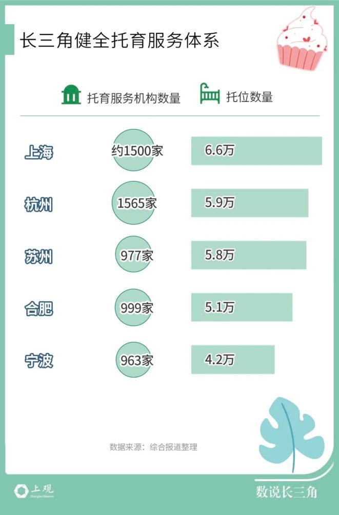 近年来,长三角各地都在推进托育服务的覆盖度。数据显示,上海已拥有约1500家托育服务机构,提供6.6万个托位;杭州1565家机构提供5.9万个托位;苏州977家机构提供5.8万个托位……