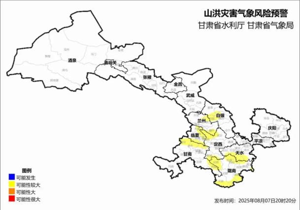 甘肃省水利厅、甘肃省气象局于2025年08月07日20时联合发布山洪灾害气象风险黄色预警: