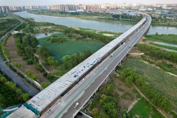 渭河特大桥位于咸阳市秦都区曹家寨村西,沿渭河冲洪积平原横跨渭河,左幅为原桥加固后利用,桥长996.5米,右幅为新建桥梁,上部结构采用预制箱梁+波形钢腹板连续梁+钢混组合梁,桥长1085米。