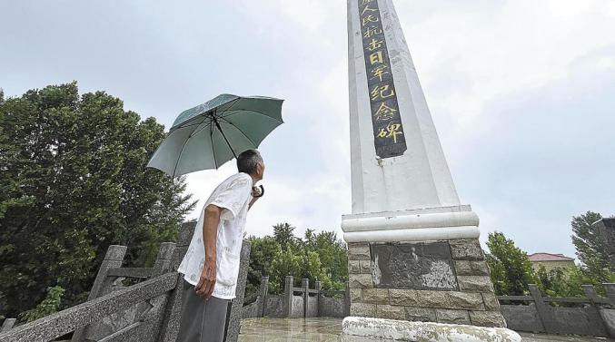 8月1日建军节,阴雨绵绵。记者跟随王守业老人来到宋庄人民抗击日军纪念碑前,雨丝打湿碑身,“英灵永在、浩气长存”八个大字在阴沉的天色中愈发清晰,透着穿透时光的肃穆。作为那场战斗的见证者,88岁的王守业在碑前默默伫立,仰视碑顶良久,目光仿佛穿越了八十载光阴,回到了那个战火纷飞的年代。