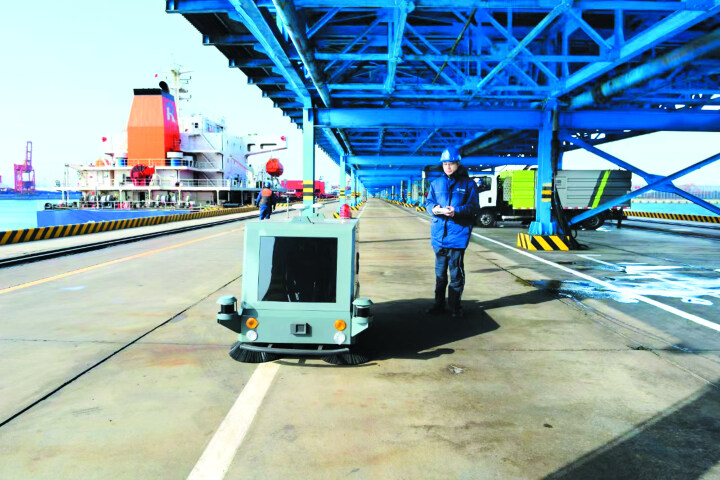 智能清扫机器人在码头上按照规划路线自主清扫。通讯员 郑钧 摄