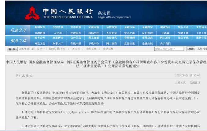 近日,中国人民银行、国家金融监督管理总局、中国证监会联合发布《金融机构客户尽职调查和客户身份资料及交易记录保存管理办法(征求意见稿)》(下称《办法》),面向社会公开征求意见。该征求意见稿截止日期为9月3日。