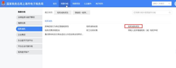 登录新电子税局后,您可点击【我要办税】-【税收减免】-【税收减免报告】功能菜单进入,或在搜索栏搜索“税收减免报告”点击跳转。