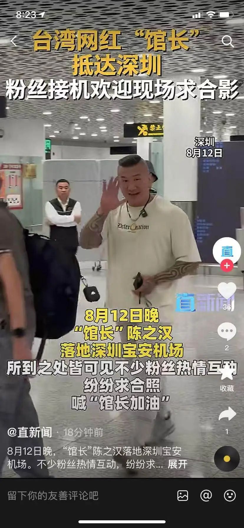 原标题:《刚刚!台湾网红“馆长”陈之汉抵达深圳机场》