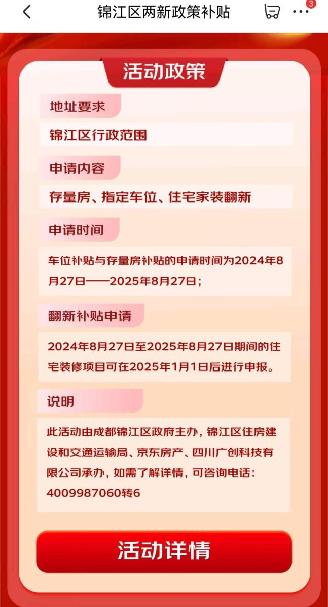 锦江区住房建设和交通运输局:锦江区“以旧换新”(包含购车位补贴)政策已发布,消费者可通过京东APP端口进行办理和领取(搜索关键词“锦江区两新”),最终规则以APP上显示为准,审核结果将通过电话、短信的形式进行告知。