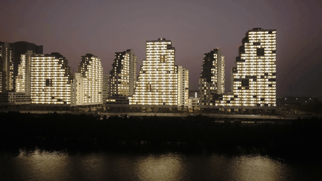 其中,11栋企鹅公寓呈现模数化排列,象征着互联网企业的技术底色,组合构成四座山形的公寓楼组团,每栋公寓楼组团的中心都设置了绿色庭院。