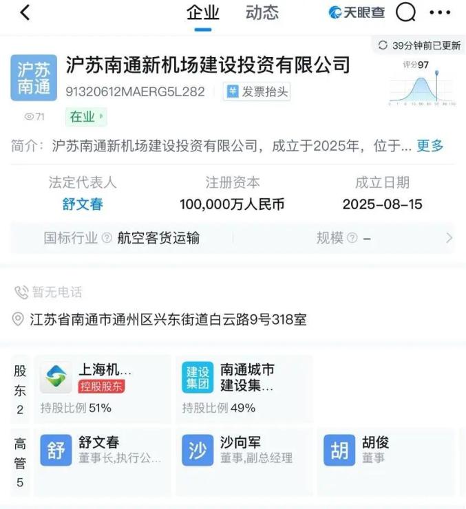 近日,南通新机场迎来实质性进展。天眼查App显示,沪苏南通新机场建设投资有限公司于8月15日正式注册,由上海机场集团与南通城市建设集团合资成立。其中,上海机场集团持股51%,南通城建集团持股49%。