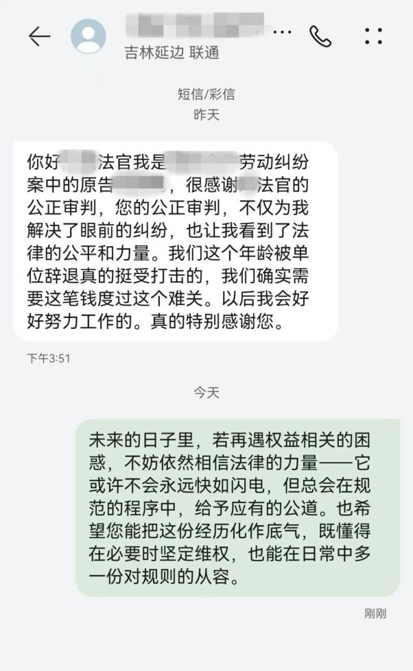 案件判决后,高某向承办法官发来了对其公正审判的感谢信息,承办法官亦对其今后的生活和工作发出鼓励和寄语。