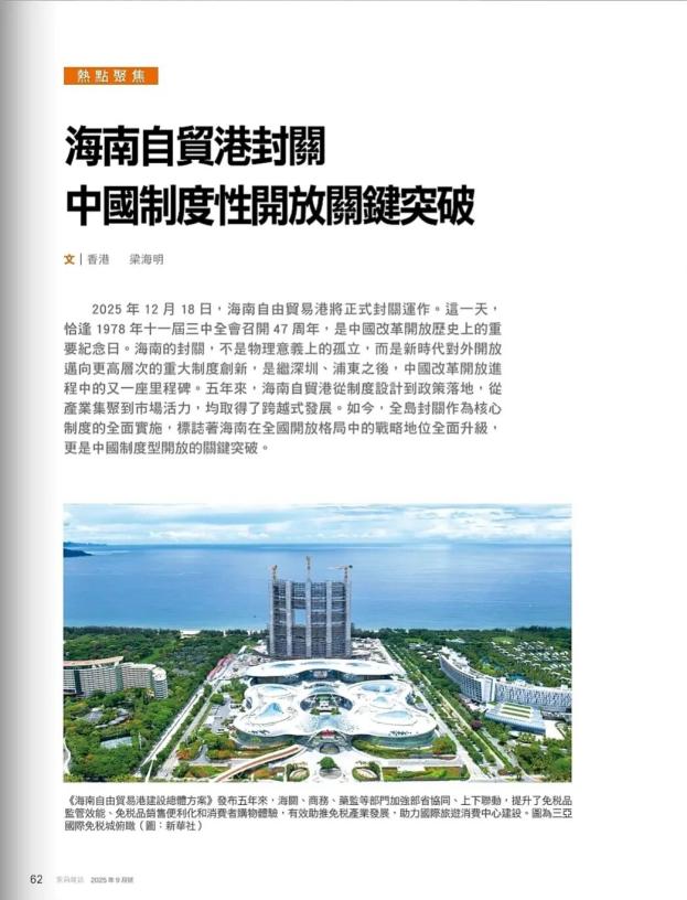 总之,海南自贸港年底封关运作,是中国对外开放进入新阶段的重要标志。五年来的制度创新与政策积淀,正逐步转化为经济发展的强劲动能。这一制度安排不仅提升了海南在全球经济体系中的能级,也彰显了中国迈向制度型开放的坚定决心。而站在国家战略的高度来看,香港与海南的联动发展,将成为中国新一轮高水平开放的重要支点。未来,随著制度对接不断深入、产业协同持续推进、开放红利加速释放,海南与香港有望携手打造面向世界的自由贸易新高地,为中国构建开放型世界经济贡献坚实力量。