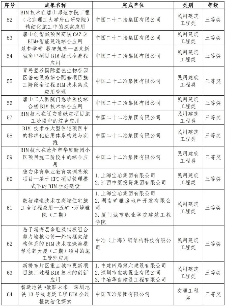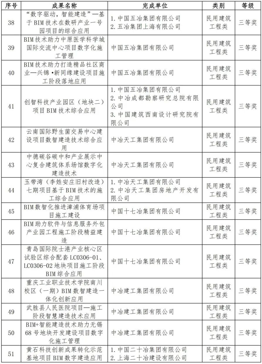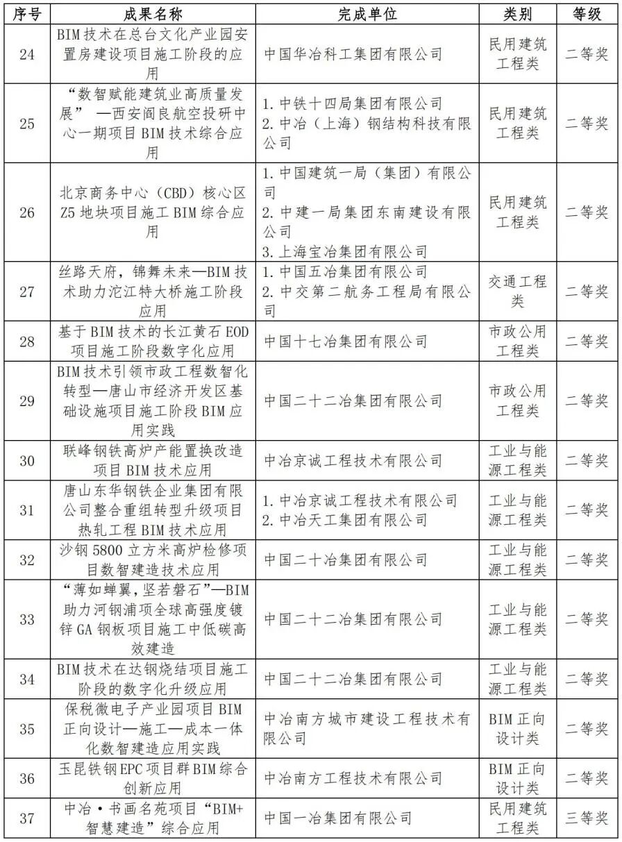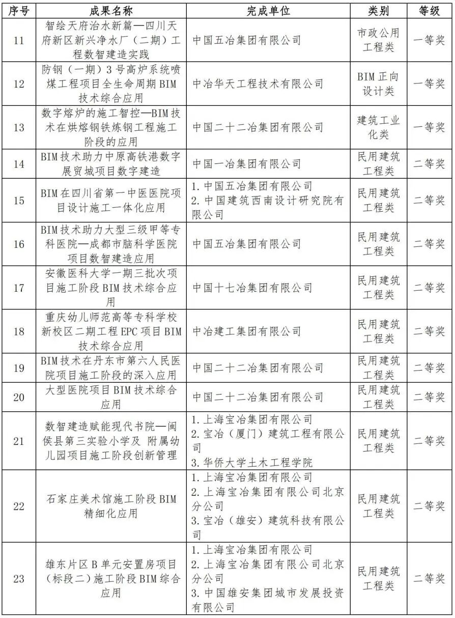 中国五冶的“智慧赋能·医脉相承—基于BIM的四川大学华西高新医院智能建造体系创新应用”等3项成果,上海宝冶的“‘晶耀湘江·智筑未来’长沙五矿广场项目超高层数智建造创新应用”等2项成果,中冶赛迪的“团结湖数字经济产业园EPC项目全过程智慧建造综合应用”,中冶华天的“防钢(一期)3号高炉系统喷煤工程项目全生命周期BIM技术综合应用”,中国二十二冶的“数字熔炉的施工智控—BIM技术在烘熔钢铁炼钢工程施工阶段的应用”和中冶钢构的“北京城市副中心住房项目(0701街区)家园中心项目第二标段全生命周期智能建造创新实践”共9项成果荣获一等奖。