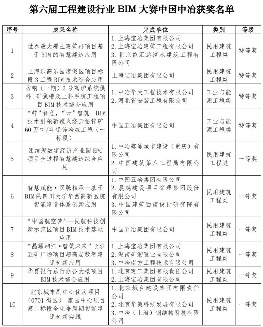 其中,上海宝冶的“世界最大覆土建筑群项目基于BIM的智慧建造应用”和“上海乐高乐园度假区项目标段3工程BIM技术综合应用”,中冶华天的“防钢(一期)3号高炉系统供料、矿焦槽及上料系统工程项目BIM技术综合应用”和中国五冶的“‘锌’征程,‘云’智筑—BIM技术引领新疆火烧云铅锌矿60万吨/年铅锌冶炼工程(一标段)”共4项成果荣获特等奖。