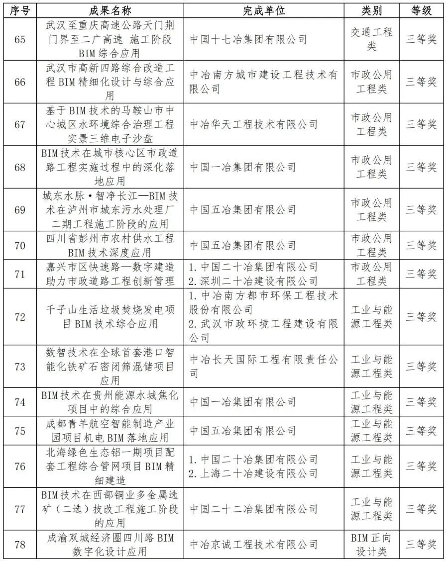 中冶京诚、中冶南方、中冶华天、中冶长天、中国一冶、中国五冶、中冶天工、中国十七冶、中冶建工、中国二十冶、中国二十二冶、上海宝冶、中国华冶、中冶钢构等单位完成的成果分别获得本届大赛二等奖和三等奖。