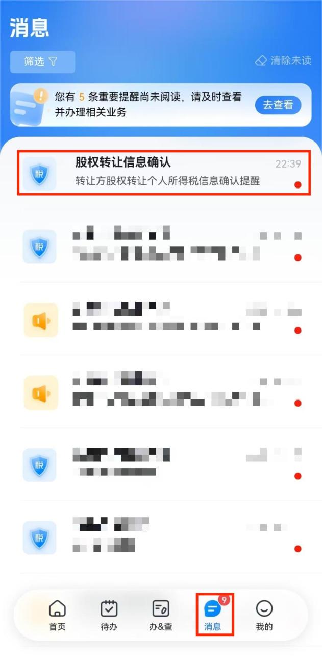 以扣缴端为例:点击“消息中心”或“待处理事项”模块,可查看股权转让确认信息。对股权转让信息进行核对,操作流程参考上述APP相关操作。