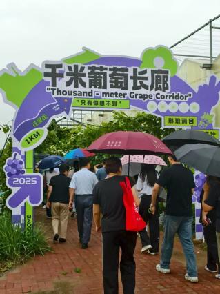 走进天津张家窝柒鲜女葡萄种植有限公司,一座座现代化葡萄大棚鳞次栉比,千米葡萄文化长廊让观众目不暇接。在葡萄主题营地入口处,农业技术专家首先向观众介绍了营地建设的基本情况。他讲:西闫·垂珠堡”葡萄主题营地整体占地面积达280亩,是张家窝镇西闫庄村股份经济合作社打造的精品现代农业示范项目。经过两年改造建设,让曾经一度闲置的葡萄园焕发新生,不仅解决了土地资源闲置问题,更为当地村民带来了实实在在的经济收益。现营地内种植了阳光玫瑰、浪漫红颜、蓝宝石、葡之梦、玫瑰香等7个品种的鲜食葡萄。为了提升营地内葡萄整体品质,他们对大棚设施进行了改造修整,对土壤进行了改良提升,棚外围搭建了防虫网,同时,采取对葡萄套袋、无公害、现代化技术进行种植和管理,提高葡萄的食品安全和果肉品质。目前,阳光玫瑰葡萄已经成熟,它的香气和甜度均高于市场同类产品。这里不仅仅是一个葡萄种植园,更是一个集观光、采摘于一体的综合性农业旅游景点。在葡萄文化展厅,他们还设置了新品种葡萄品尝环节,阳光玫瑰、蓝宝石等优质葡萄的出色口感,让参与者真切感受到科技创新对农产品品质的赋能。