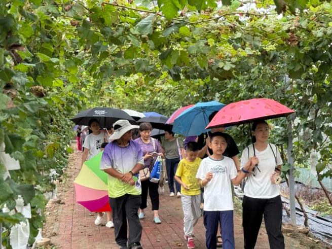 在营地负责人的带领下,大家漫步于青翠藤蔓的千米葡萄文化长廊之下,近距离观赏并亲手采摘新鲜葡萄即刻品尝。“葡萄飘香引客来、休闲采摘正当时”。在葡萄种植区,一串串葡萄生长在错落有致的葡萄藤上,垂下的是视觉的盛宴,也是味蕾的欢喜。一些家长与孩子不由自主的提着篮子,手握剪刀,穿梭在葡萄藤下,采摘、观赏,品尝葡萄的香甜,体验采摘的乐趣。