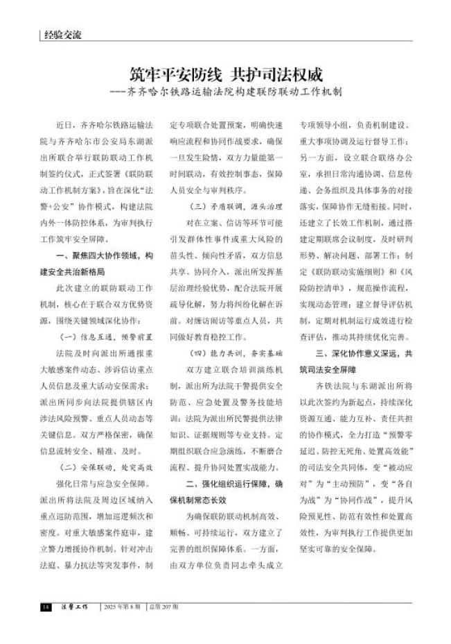 近日,齐齐哈尔铁路运输法院与齐齐哈尔市公安局东湖派出所联合举行联防联动工作机制签约仪式,正式签署《联防联动工作机制方案》。此举旨在深化“法警+公安”协作模式,构建法院内外一体防控体系,为审判执行工作筑牢安全屏障。