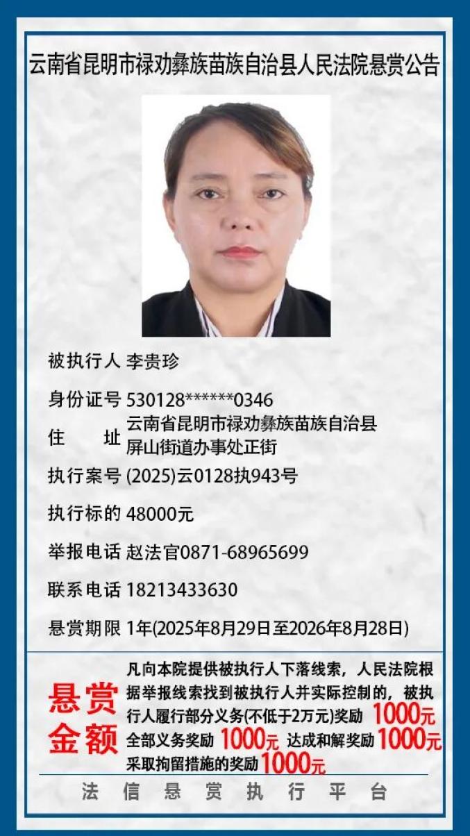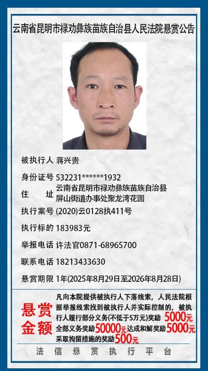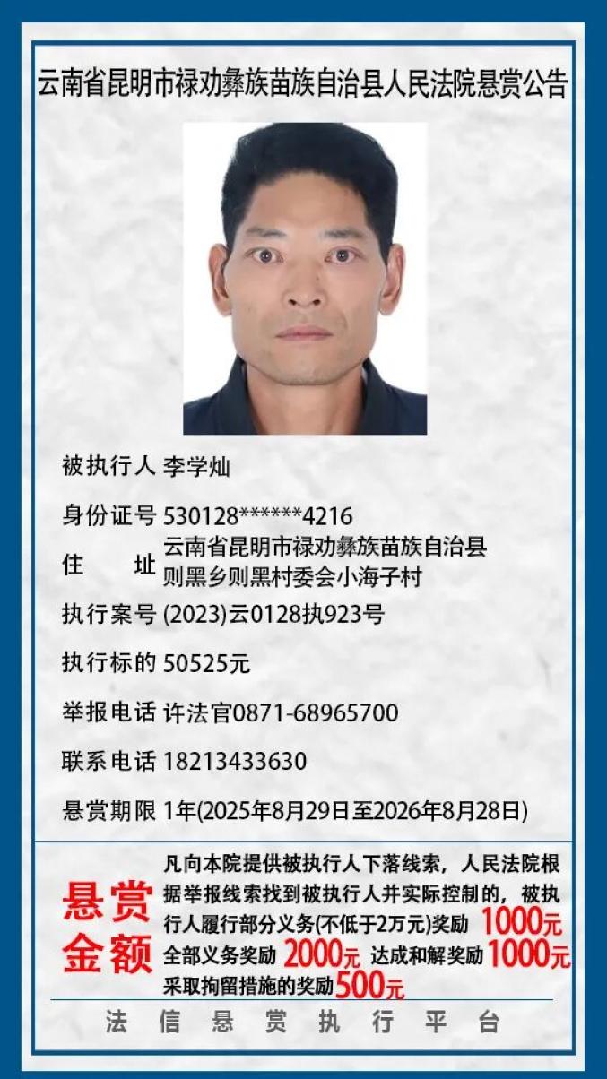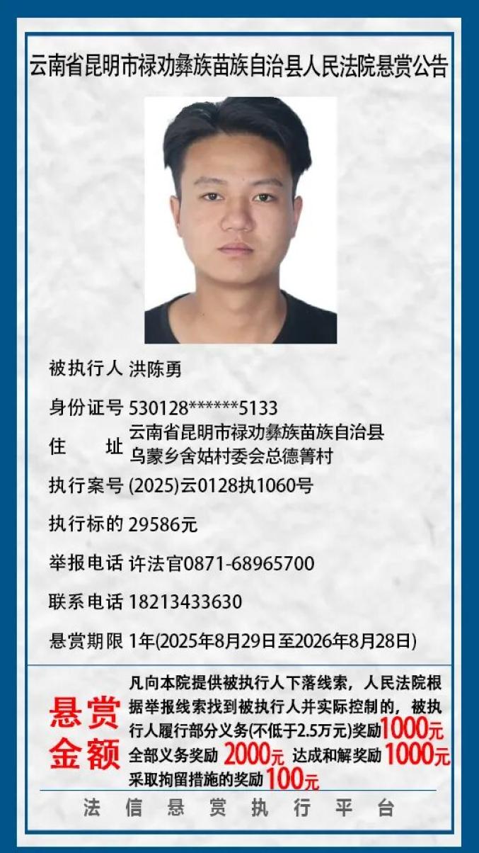 原标题:《【悬赏公告】举报有奖!禄劝法院执行悬赏公告,快来提供有效线索→(2025年第13期)》