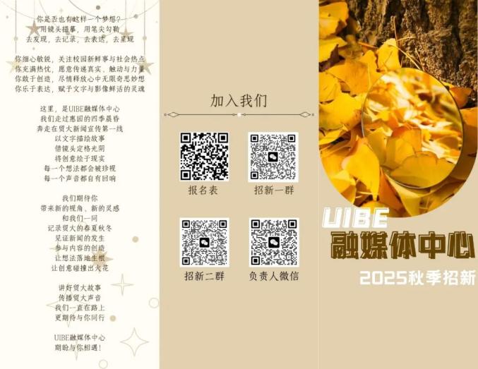 2025迎新 · 目录#2025迎新上一篇UIBE融媒体中心招新|摄影部:自我显影下一篇UIBE融媒体中心招新|新媒体部:灵感火花继续滑动看下一个轻触阅读原文