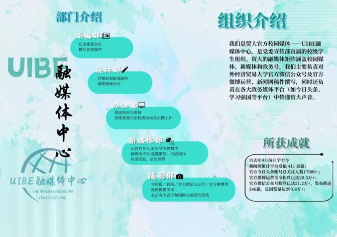 我们是采编部,隶属于校党委宣传部,是对外经济贸易大学官方校园媒体【UIBE融媒体中心】下属的部门之一。我们负责为官方微信公众号深度供稿、校报策划采编和新闻网内容生产与发布。通过敏锐洞察校园热点,发掘新鲜故事,以专业视角,为贸大人传递权威、鲜活、有深度的声音。